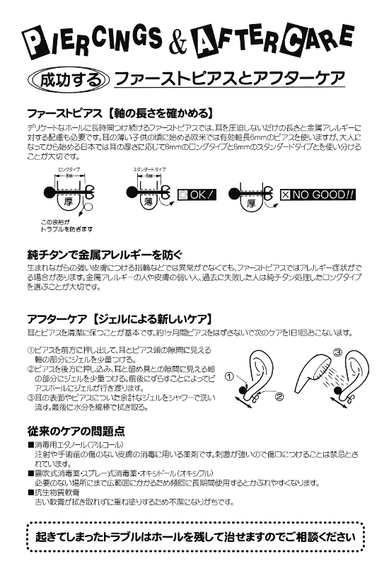 ピアスホールが完成するまでの注意点やアフターケアについて説明しています。